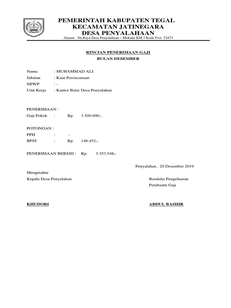 Slip Gaji Perangkat Desa. Gaji Perangkat Desa Tahun 2020 Setara Dengan Gaji Pegawai Negeri Sipil PNS Golongan IIa. Karyawan Tetap PENGHASILAN POTONGAN Gaji Pokok 1800000 PPh 21 Tj.